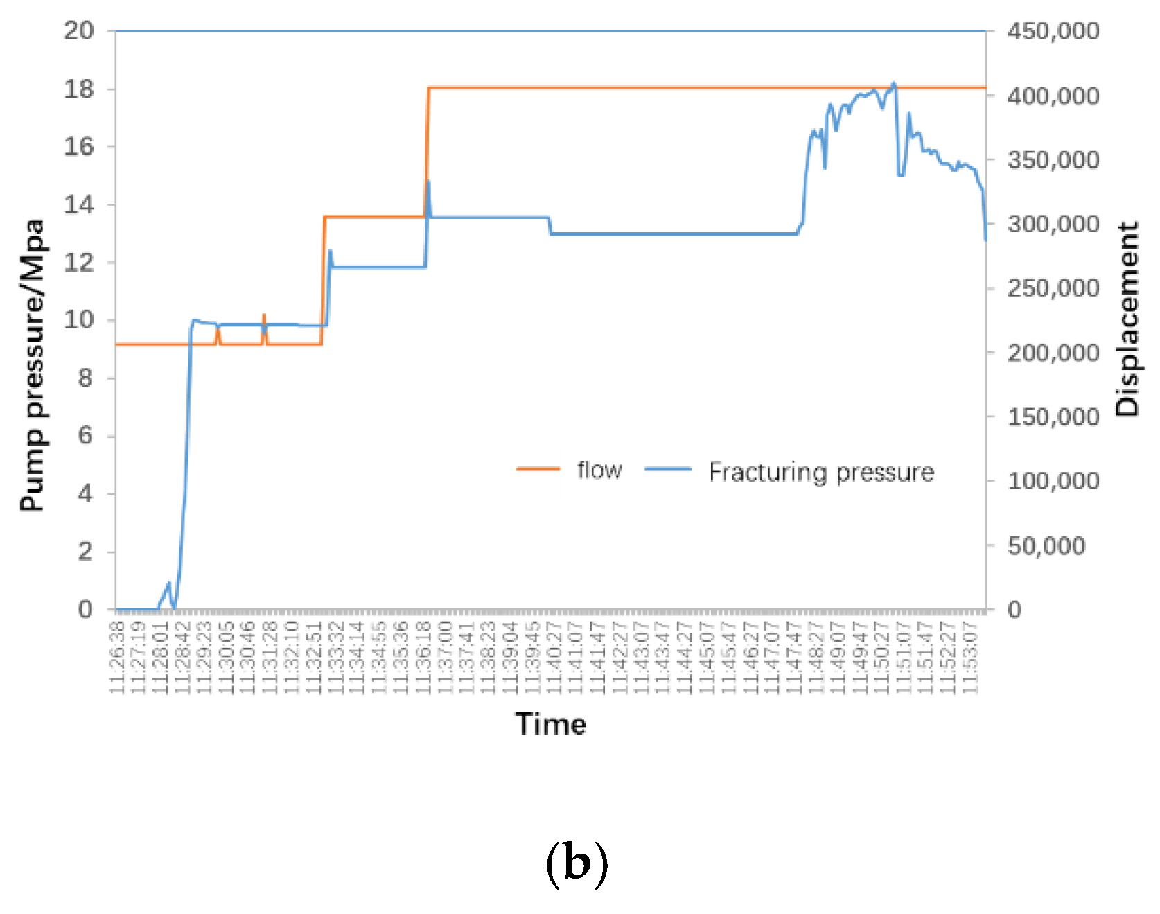 (2) Based on the compression cracking experiment of large object molds, it is concluded that generating effective micro-cracks and activating them to form efficient diversion channels is the key to pressure flooding injection. Combining the mechanical characteristics of the rock in the target layer to precisely control the injection speed and injection pressure can maximize the fracture network, thereby improving the reservoir to achieve the purpose of pressure reduction and injection increase. The constant injection displacement is at 13.99 Mpa, and the maximum injection pressure is 19.2 Mpa. The stepped injection displacement is at 12.8 Mpa, and the maximum injection pressure is 18.1 Mpa.