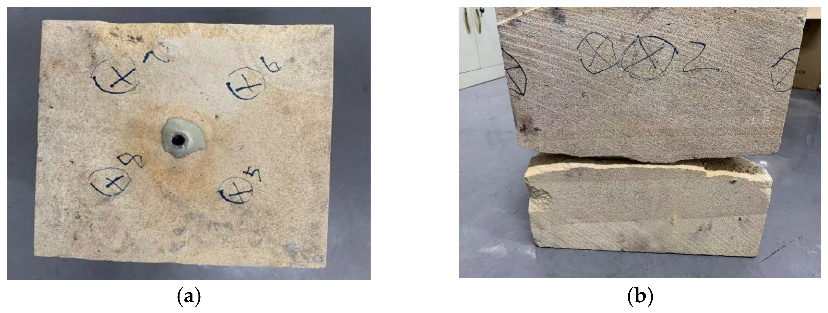Figure 5, core sampling was conducted on all surfaces of the cube sample (small columns were removed at the circular × mark), which can comprehensively detect whether cracks and micro-cracks occur in different directions.