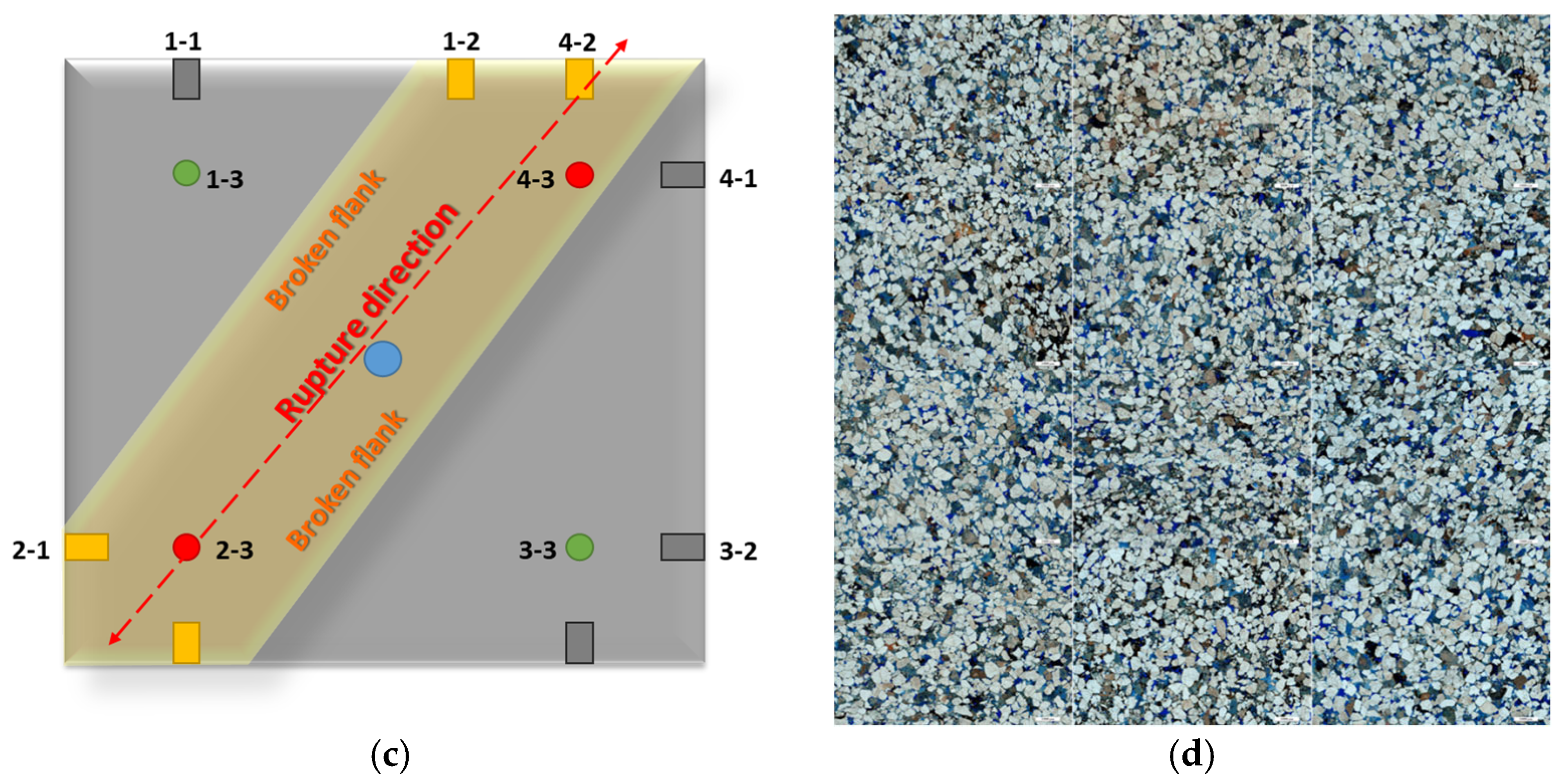 (1) Based on the rock mechanics parameters (fracture pressure, Young’s modulus, and Poisson’s ratio) of the sample from the sampling point’s plunger, triaxial pressures of 15 MPa, 12 MPa, and 10 MPa were set;
