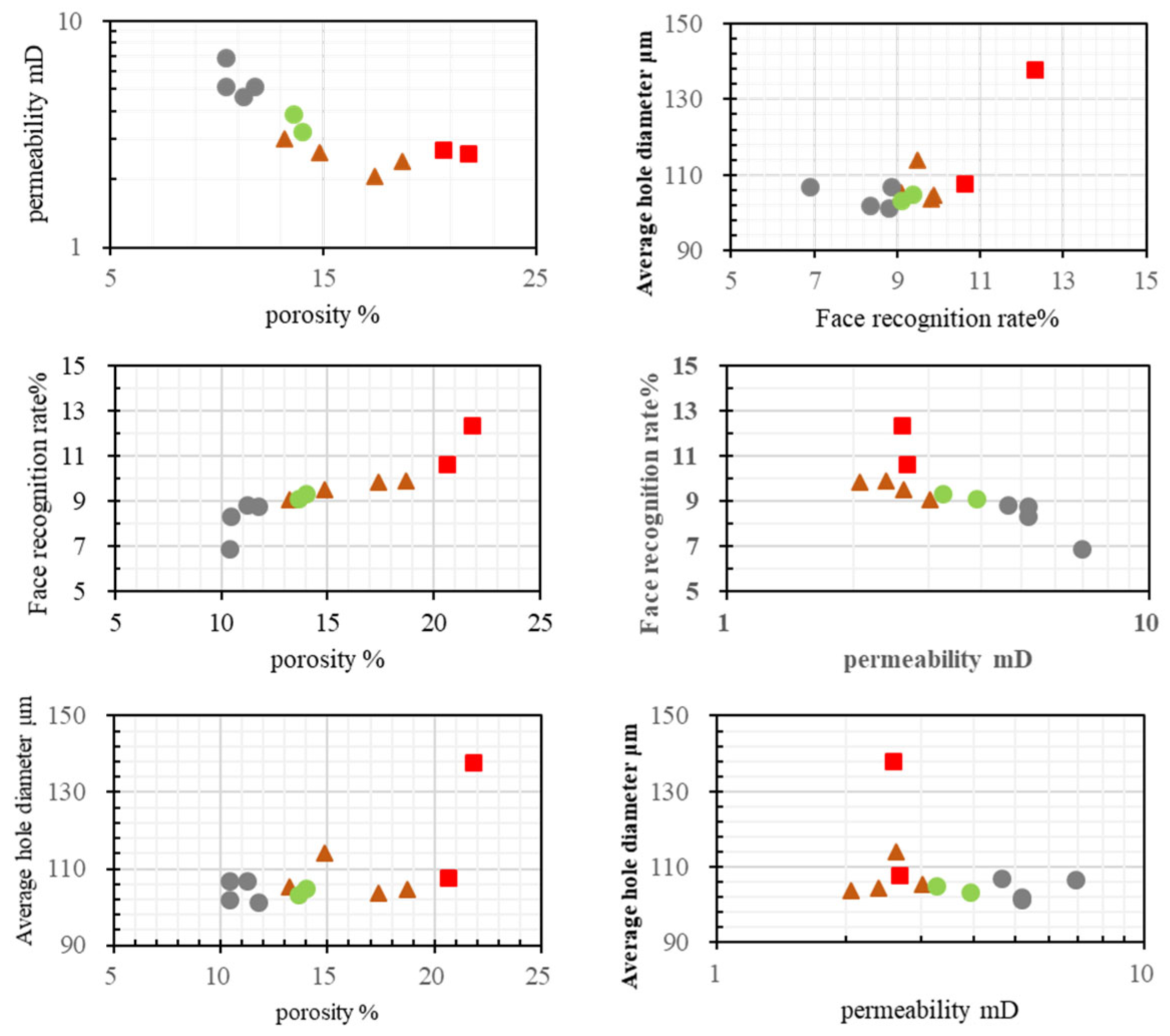 No continuous and interconnected micro-cracks were observed in the thin sections of core castings at different orientations. The statistics of the microscopic images of the main direction, flanking, and base of the fracture show no significant difference in the distribution of large pores and thick throats, indicating that the fracturing did not form continuous and connected micro-fractures. Porosity is directly proportional to the porosity rate and inversely proportional to the permeability. There is no obvious correlation between pore permeability and pore diameter. This indicates that although fracturing destroys the pore structure, it does not form continuous and interconnected micro-cracks (