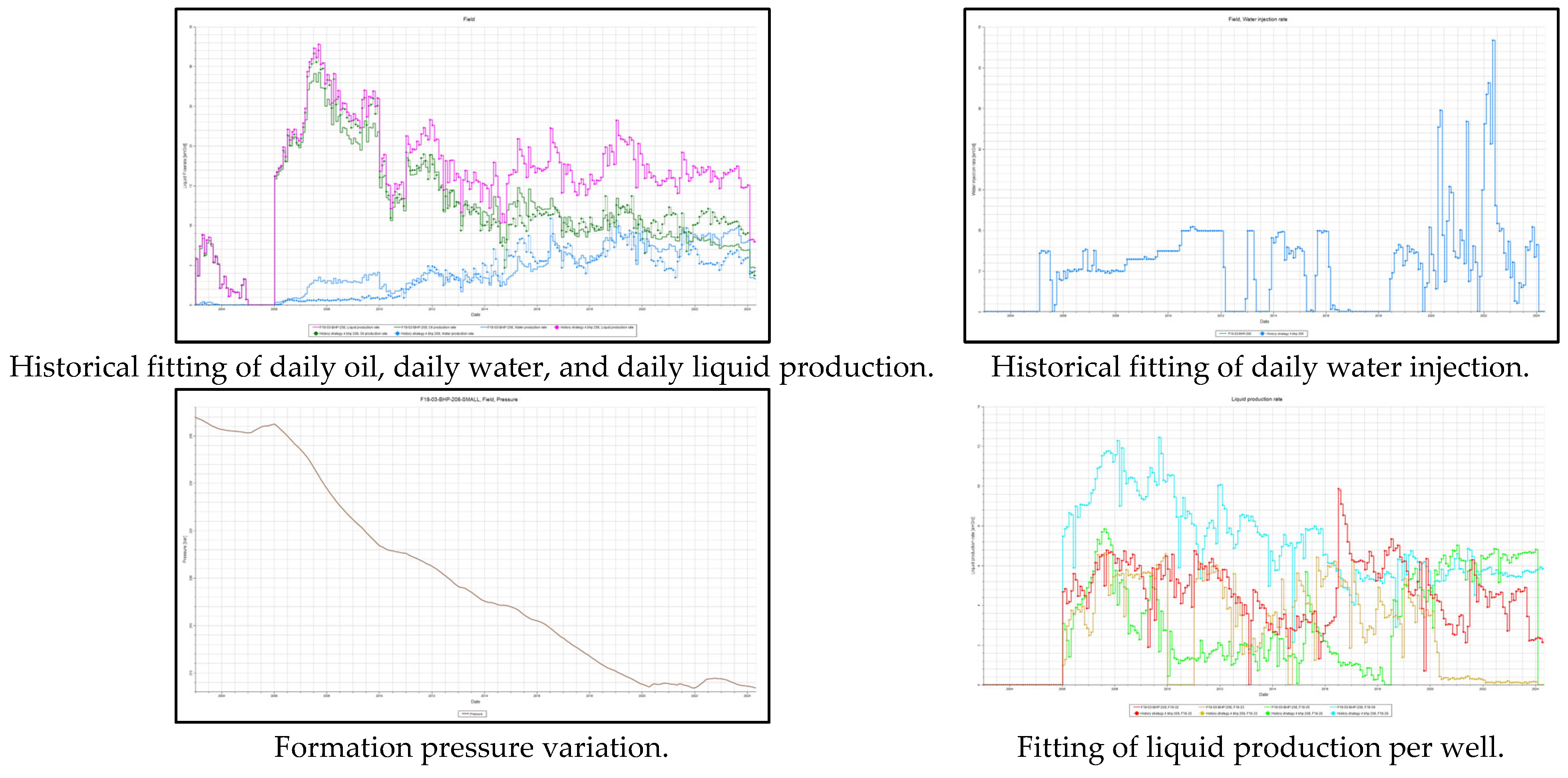 There are a total of 4 production wells and 1 injection well in the research block. The historical fitting of daily oil production, daily water production, daily liquid production, and daily water production in the study block was conducted (