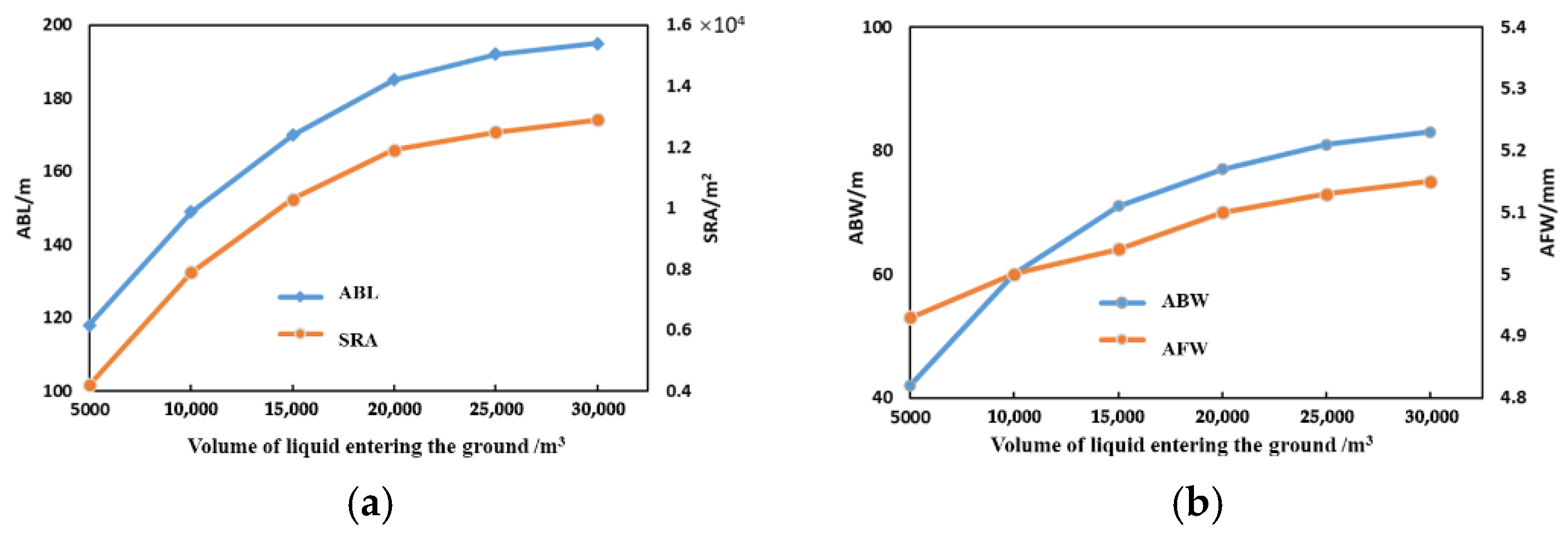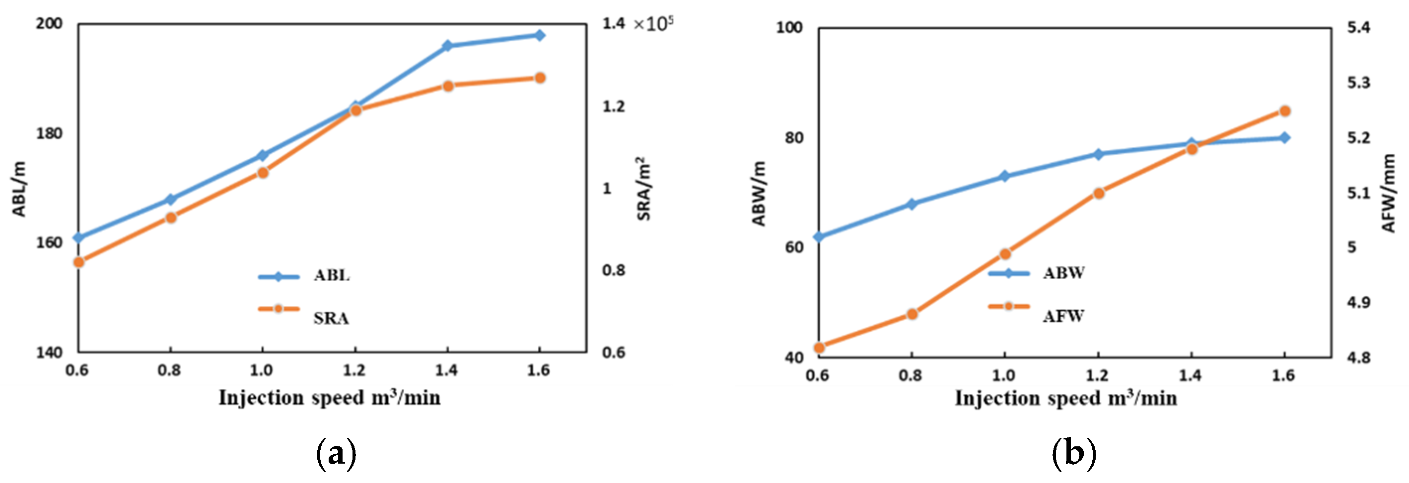 We set the injection speeds of 0.6 m3/min, 0.8 m3/min, 1.0 m3/min, 1.2 m3/min, and 1.4 m3/min, respectively. The total injection volumes of 5000 m3, 10,000 m3, 15,000 m3, 20,000 m3, 25,000 m3, and 30,000 m3 were used to simulate the expansion of the reservoir slit network in the study area, and the average slit network band length (ABL) and average slit network bandwidth (ABW) under different injection parameters were obtained. The area of the renovation zone (SRA) and the average crack width (AFW).