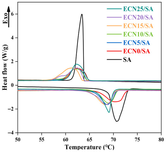 DSC curves of SA and ECNX/SA are recorded in Figure 1. Both SA and ECNX/SA exhibit one endothermic/exothermic peak, indicating that thermal storage is predominantly stored by the phase change enthalpy of SA. The parameters of thermal property are calculated based on DSC curves and listed in Table 1. It can be seen that a lower melting temperature (66.71 °C to 67.89 °C) and a higher freezing temperature are observed in ECNX/SA compared with SA. This enhancement could be ascribed to the improved thermal transfer and heterogeneous nucleation facilitated by ECNX, which accelerates the phase change process of SA [21,22]. As a result, the supercooling degree of ECNX/SA is markedly lower than that of SA (3.52 °C). In detail, as the EG mass fraction rises from 0 wt.% to 25 wt.%, the supercooling degree of ECNX/SA is decreased from 0.89 °C to 0.46 °C. This demonstrates that the addition of EG can efficiently suppress the supercooling characteristic of SA.