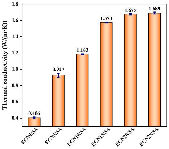 As illustrated in Figure 2, ECNX can enhance the thermal conductivity of SA (0.180 W/(m·K)) remarkably that the thermal conductivity of ECNX/SA is higher than 0.406 W/(m·K). Moreover, a continuous increase in thermal conductivity from 0.406 W/(m·K) to 1.689 W/(m·K) is observed in ECNX/SA as EG mass fraction increased from 0 wt.% to 25 wt.%, thereby, the addition of EG is profitable for the thermal conductivity. Notably, the thermal conductivity of ECN15/SA is 1.573 W/(m·K), while the value fails to elevate greatly when adding EG further. This may be due to that excessive EG addition provides more cavities in ECNX/SA, which aggravates thermal resistance to hinder the enhancement of thermal conductivity [26].