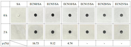The images of the heating test in Figure 3 indicate that SA is melted absolutely into a liquid, but ECNX/SA keeps a stable shape after heating. Thus, ECNX can improve the shape stability of SA. In addition, the leakage rate and area are decreased as EG mass fraction increase. From ECN0/SA to ECN10/SA, the leakage rate is decreased from 16.73% to 4.74%, and no leakage is observed in ECN15/SA, ECN20/SA and ECN25/SA.