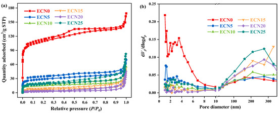 The N2 isothermal adsorption–desorption and pore diameter distribution of ECNX is depicted in Figure 4. ECNX exhibits the characteristic of type I-IV isotherms equipped with H3 hysteresis loop (Figure 4a), revealing its micropore and mesopore structure. Furthermore, a certain adsorption is detected at high relative pressure (P/P0 > 0.9) that suggests a macropore structure exists in the ECNX. Therefore, ECNX, with a hierarchical pore structure, can provide capillary force and a large space to encapsulate SA. It is observed that the absorption at high relative pressure is gradually elevated as increased EG mass fraction, indicating that the addition of EG can provide macropore structure for ECNX [31]. The pore diameter distribution (Figure 4b) of ECNX based on the BJH model also confirms this result that the micropores and mesopores are reduced below 10 nm and macropores are increased above 100 nm as the EG mass fraction increasing from 0 wt.% to 25 wt.%.