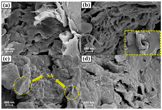 SEM images are employed to conduct the morphology of samples. In Figure 7a, a few macropores are observed on the surface of ECN0; this is due to the tight arrangement of chitin molecules difficult to generate pore structure during carbonization. In contrast, numerous macropores and worm-like structures are inspected in ECN15 (Figure 7b) owing to the EG addition, which can provide a larger space to encapsulate SA [40]. The images of ECN0/SA and ECN15/SA further illustrate this opinion. In Figure 7c, the surface of ECN0/SA shows free SA particles, where ECN0 is covered by excessive SA. This indicates that ECN0 with poor macropores fails to encapsulate SA completely. While SA is adsorbed on the surface of ECN15 (Figure 7d), and be infiltrated into the pore structure. Therefore, ECN15 can prevent SA leakage efficiently than ECN0, making a superior shape stability in ECN15/SA.