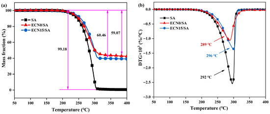 TG curves (a) and DTG curves (b) of SA, ECN0/SA and ECN15/SA.