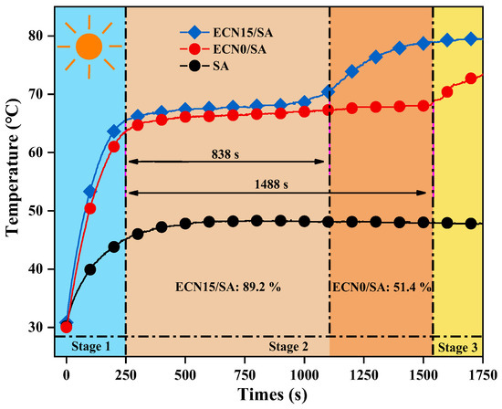 This study also considers the photothermal conversion of samples in Figure 9. SA display two stages under radiation, where its temperature elevates from 30 °C to 45 °C within 0 s to 250 s, subsequently keeping stable. Obviously, the terminal temperature of SA is below its phase change temperature, reflecting a poor photothermal conversion. For ECN15/SA, it is detected three stages under radiation. In detail, the temperature of ECN15/SA is elevated from 30 °C to 65 °C in the range of 0 s to 250 s; after that, the temperature arrives at plateau in a period of 250 s to 1530 s corresponding to the phase change process. Finally, the temperature of ECN15/SA climbs from 68 °C to 79 °C within 1530 s to 1750 s. This demonstrates an extraordinary photothermal conversion in ECN15/SA that the photon is captured by ECN15, preserving the phase change enthalpy of SA [42]. ECN0/SA exhibits a similar curve than ECN15/SA, however, ECN0/SA has a longer plateau in the range of 250 s to 1500 s. Therefore, EG addition is favorable for further improving the photothermal conversion of SA. It is ascribed to that high graphite degree can prevent photon scattering [43,44]. The photothermal conversion efficiency of ECN15/SA and ECN0/SA is calculated as 89.2% and 51.4%, reflecting a good photothermal conversion in ECN15/SA.