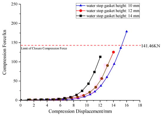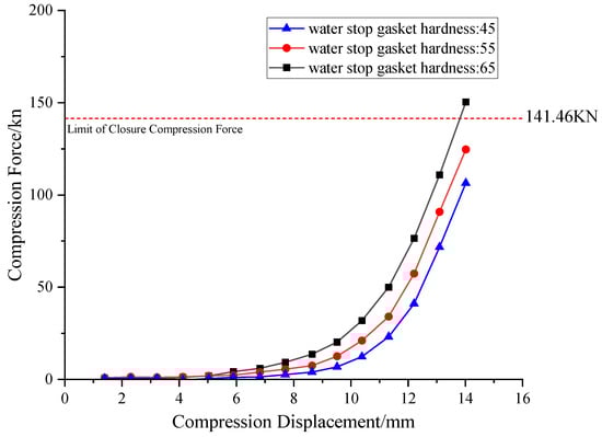 Based on the design requirements for the bolt hole sealing gasket, this study extracts the compression-closure force curve from the sealing gasket’s numerical model. The compression reaction force when the gasket is compressed to 2 mm is taken as the design index for the closure compression force. Like traditional elastic sealing gaskets that rely on physical compression to generate contact stress for waterproofing, the Novel sealing gasket also forms contact stress through physical compression against the segment, thereby effectively preventing water penetration.