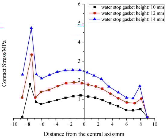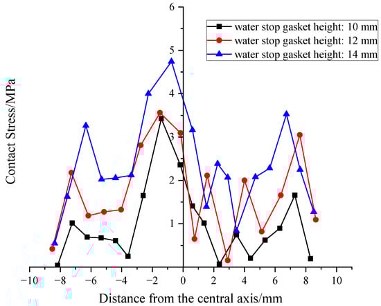 However, there might be two potential leakage pathways between the sealing gasket and the segment: one at the upper part and another at the lower part (as shown in Figure 6). Therefore, when the gasket is compressed to 8 mm, the contact stress at both the upper and lower parts of the gasket are extracted, and their average value is used as the evaluation standard for waterproofing performance. This allows for a systematic analysis of the Novel sealing gasket’s waterproofing performance and design indices under the most unfavorable conditions.