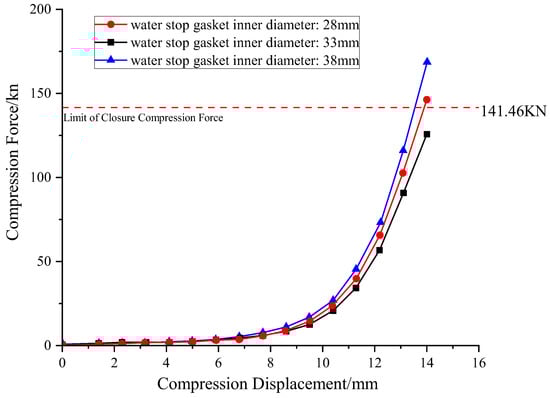 Analyzing the compression-closure force curves in Figure 16 reveals a clear trend: the gasket’s closure compression force exhibits a strong positive correlation with its inner diameter. When the inner diameter was 28 mm, the closure force was 125.13 kN. As the inner diameter increased to 33 mm and 38 mm, the closure force correspondingly climbed to 146.26 kN and 168.34 kN. This trend can primarily be attributed to the total material volume of the gasket: assuming constant cross-sectional geometry and outer diameter, the gasket’s total material volume is approximately proportional to its circumference, and thus directly related to its inner diameter. Therefore, a larger inner diameter means more material is involved in load-bearing, leading to a correspondingly higher accumulated macroscopic compression reaction force under the same compression strain. Under this influence, only the 28 mm inner diameter option met the closure force design specifications.