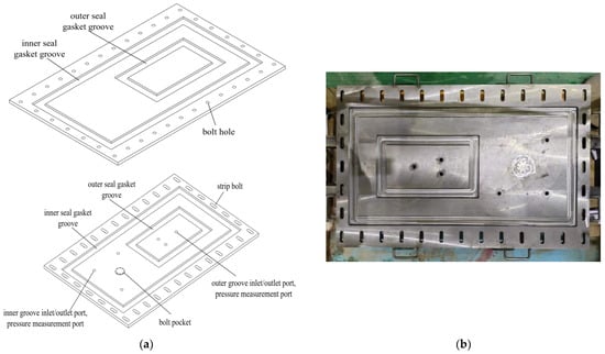 The test setup includes two grooves, an inner and an outer, both of identical dimensions. These grooves can accommodate frame-shaped Sealing Gaskets as needed for the experiment. Their dimensions and the cross-sectional shape of the Sealing Gaskets perfectly match those used in the numerical simulation.