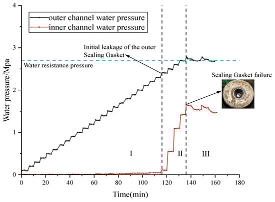 Post-Leakage State: After the system fails, the external and internal chamber water pressures eventually stabilize around 2.8 MPa and 1.4 MPa, respectively. The consistent pressure difference between the two (ΔP ≈ 1.4 MPa) strongly demonstrates that even after the overall system leaks, the pressure-bearing and waterproofing enhancement effect of the outer sealing gasket still persists, meaning the entire system has not completely failed.