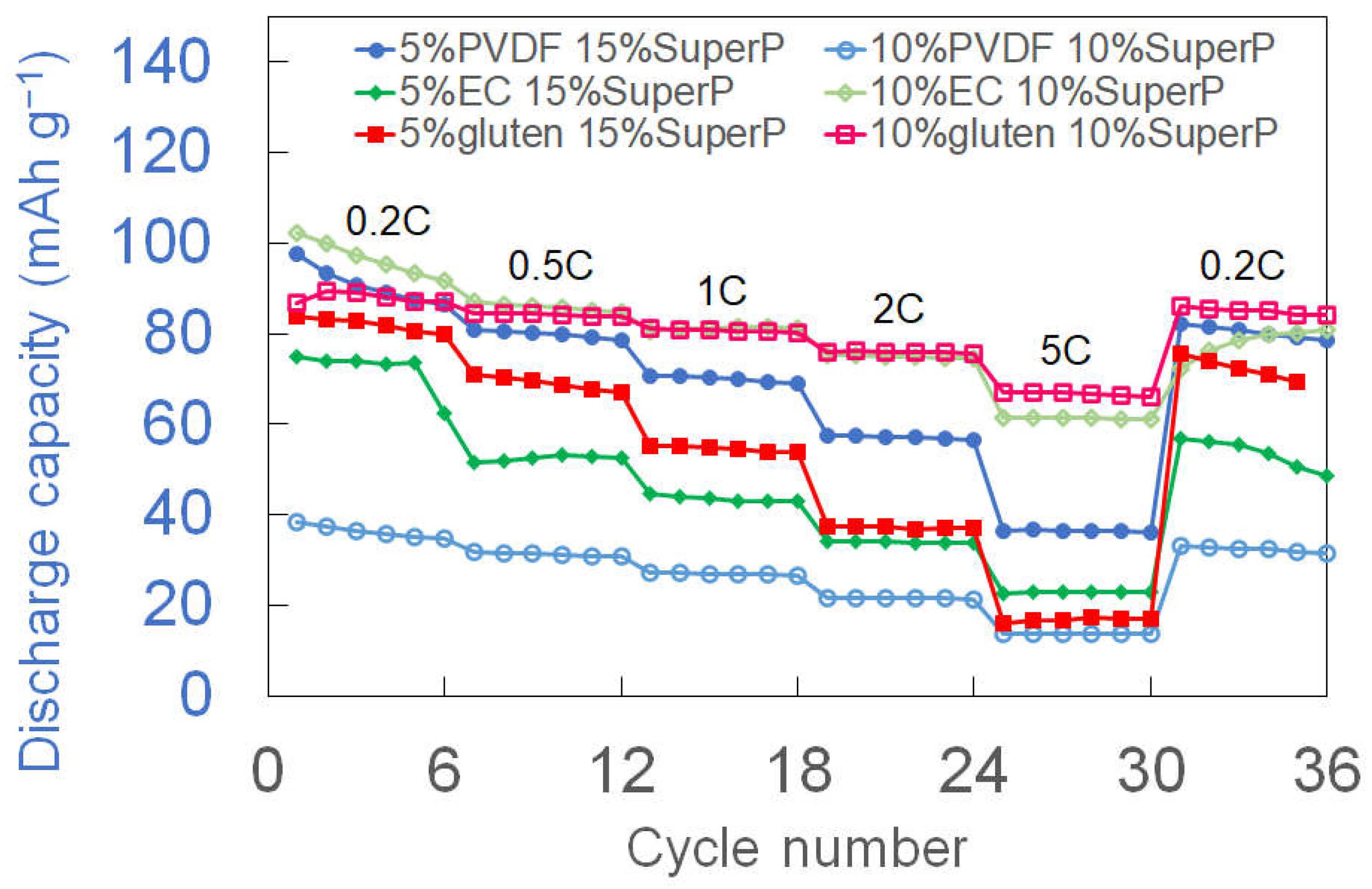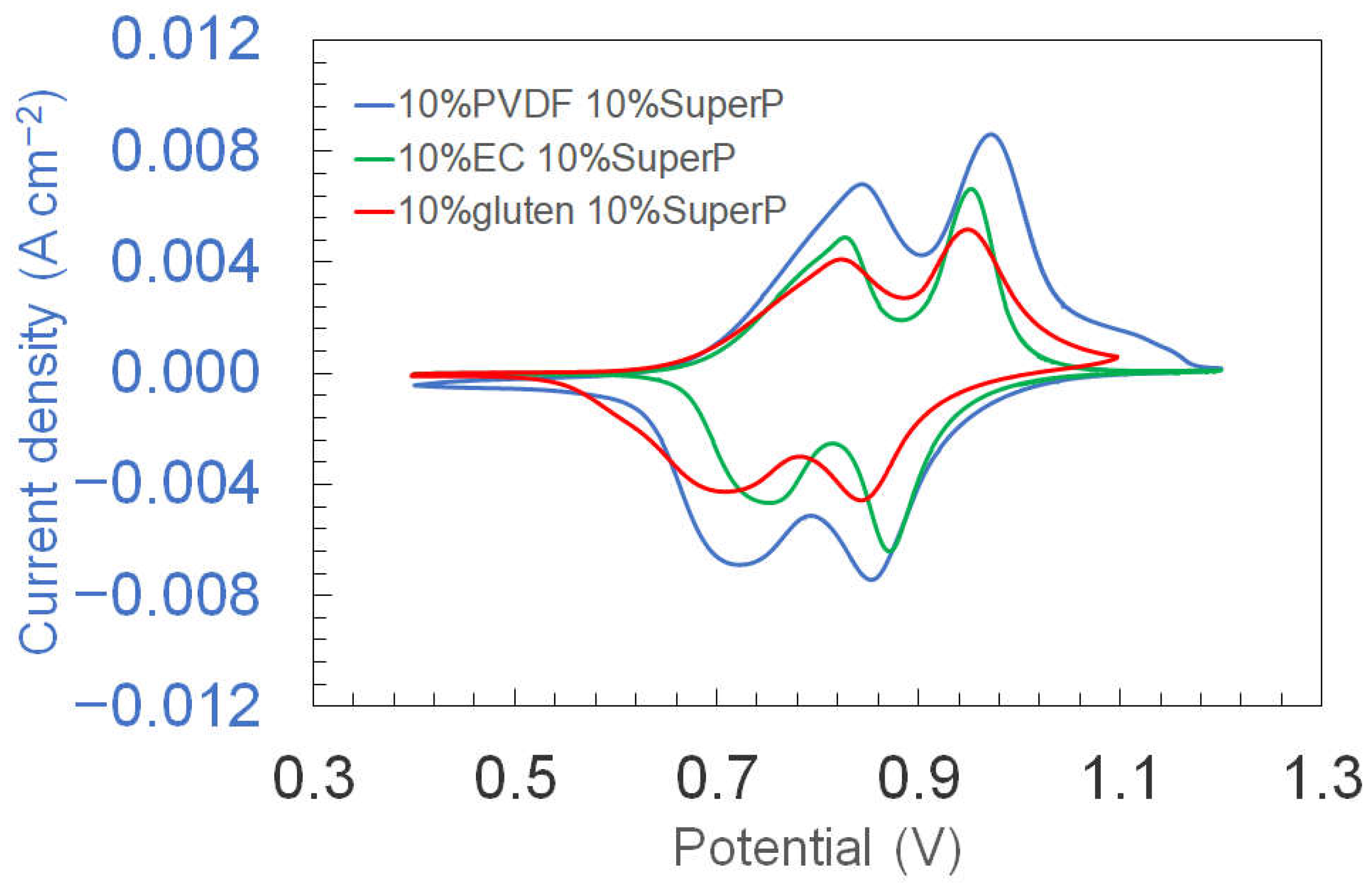 - Wang, R.; Feng, L.; Yang, W.; Zhang, Y.; Zhang, Y.; Bai, W.; Liu, B.; Zhang, W.; Chuan, Y.; Zheng, Z.; et al. Effect of Different Binders on the Electrochemical Performance of Metal Oxide Anode for Lithium-Ion Batteries. Nanoscale Res. Lett. 2017, 12, 575. [Google Scholar] [CrossRef] [PubMed]