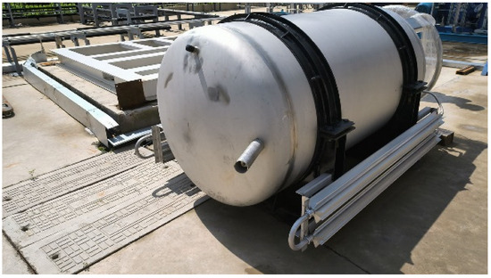 The chosen large-volume on-board liquid hydrogen tank model, featuring a diameter of 1.2 m and a length of 2.3 m, serves as the reference for modeling. The internal storage tank measures 2 m in length and 1 m in diameter. The inner and outer storage tanks are the insulated layer and vacuum layer. The physical part and the model part of the liquid hydrogen bottle are given in Figure 1 and Figure 2, respectively. Connectors that are irrelevant to this simulation have been excluded.