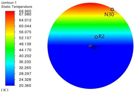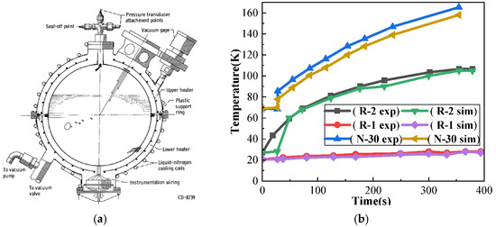 The measured values of the temperature probes at N30, R2, and R1 in the experiment of J.C. Aydelott et al. [38] were used as the reference group. The spherical tank model used in the experiment and the temperature–time distribution curve obtained in the experiment are shown in Figure 6. The specific placement positions and the final temperature distribution are illustrated in Figure 7. The results of the simulation analysis are presented in Table 2. The NASA experiment used a vacuum-jacketed spherical liquid hydrogen storage tank with a diameter of 23 cm, a wall thickness of 0.0254 cm, and was surrounded by an ejector heater. R1 and R2 are 11.43 cm and 7.37 cm away from the tank wall, respectively, and N30 is close to the tank wall. Therefore, the simulation group liquid hydrogen tank model is set to a vacuum spherical tank with a diameter of 23 cm, an inner tank diameter of 20 cm, and a wall thickness of 0.0254 cm. The tank material is austenitic stainless steel. The heat source is set at the same position as the actual position of the experimental group.