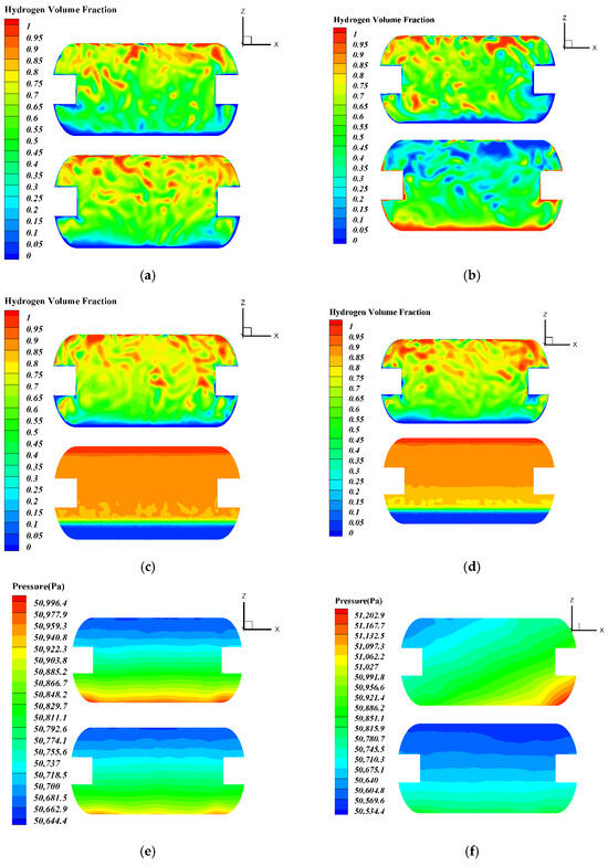 When combined with Figure 8a–d, it can be observed that due to the influence of the initial temperature difference between the gas and liquid phases, at the beginning of the simulation, the heat and mass transfer between the gas and liquid phases in condition 1 is more intense, and the fluid domain in the bottle is generally characterized by the top and bottom of the liquid hydrogen bottle. The gas–liquid two-phase is relatively stable, and the two sides of the gas–liquid interface are more chaotic. Different from operating condition 1 in the static state, due to the movement of the fluid domain, the phase transition occurs at the bottom of the liquid hydrogen bottle under operating condition 4 at 6 s, and the original liquid phase region appears to demonstrate gas phase stratification, while the original gas phase region appears to demonstrate the liquefaction phenomenon. This is because the movement leads to the mixing of the gas–liquid phases, which greatly improves the contact area of the two phases and aggravates the heat and mass transfer between the two phases. In addition, since the fluid domain in operating condition 4 tends to be static at 6 s, the conversion of kinetic energy also promotes this phenomenon. With the passage of simulation time, at 9 s, the phase distributions of condition 1 and condition 4 are basically the same. At 120 s, the stable liquid region of condition 4 is thinner than that of condition 1, and the phase stratification is more regular than that of condition 1 after movement.