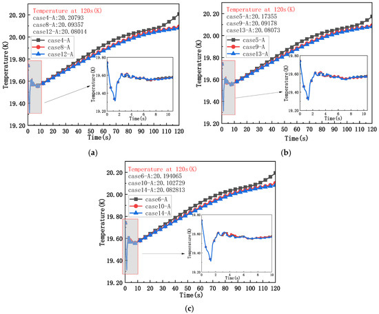 The conditions 4–6, 8–10, and 12–14 are divided into three groups according to the same operating pressure. The temperature change at the detection point A is taken to study the thermodynamic behavior of the liquid hydrogen bottle with the change of the insulation layer, as shown in Figure 10.