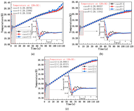 To investigate the changes in thermodynamic behavior at different insulation thicknesses and across different locations within the liquid hydrogen tank, detection points A, C, and E under conditions 4, 8, and 12 were selected as the research subjects. The temperature changes at the detection points A, C, and E are shown in Figure 11 below.