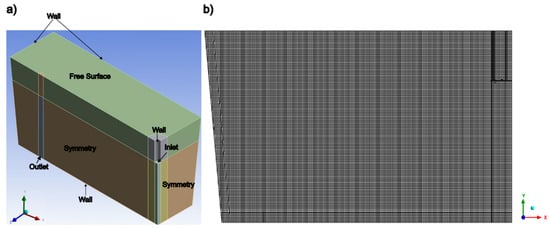 (a) Boundary conditions of the computational domain, (b) Domain mesh on the symmetry plane xy.
