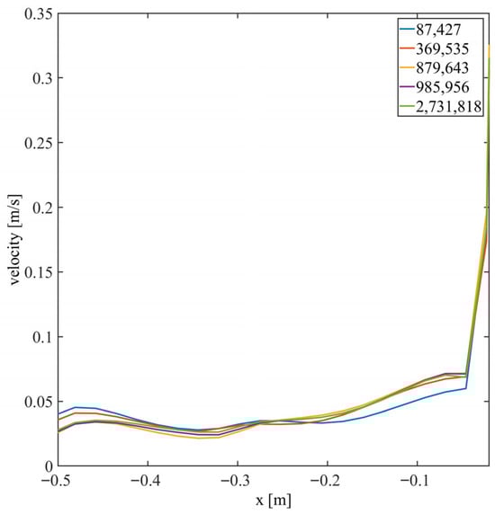Grid sensitivity study. Velocity profile of the fluid along a horizontal line from the center of the water inlet (0.0 m) to the lateral wall (0.5 m) at a height of 0.10 m for all the different grids.