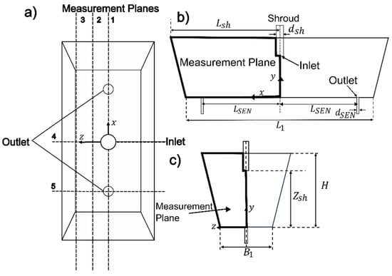 Once our model’s mathematical approach, including the turbulence model and the discretization, was validated, we proceeded to simulate the fluid flow within the tundish shown in Figure 3. The purpose was to obtain the operating velocity fields in the planes indicated in Figure 3 and compare them with the experimental results obtained by PIV.