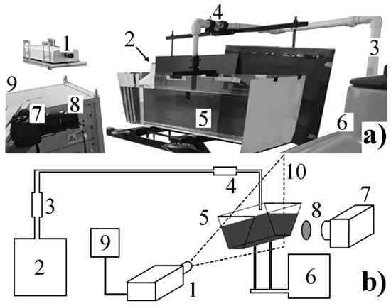 Experimental setup. (a) Photograph, (b) Scheme. The components of the setup are: (1) Laser head, (2) distilled water tank (inlet), (3) pipeline with water flow meter, (4) tracer addition point, (5) tundish physical model, (6) residual water tank (outlet), (7) camera, (8) optical filter (wavelength of 570 nm), (9) laser source, and (10) measurement plane.