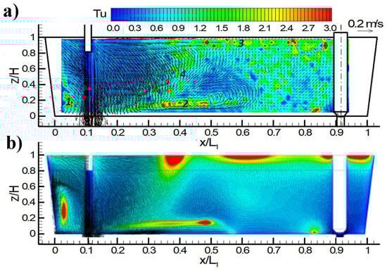 Figure 5 compares the experimental velocity vectors and the turbulence intensity () contours against our predictions from this work’s mathematical model. Turbulence intensity is calculated using Equation (22) and is defined in the paper as the ratio of fluctuating velocity to instantaneous velocity. Vectors represent the velocities, and the model predicts the same velocities in the entering jet region, in both Figure 5a,b, for both experimental and theoretical results. When the jet impinges on the tundish bottom, it changes direction and spreads along all the directions. In the measurement longitudinal plane, one part of the jet moves laterally to the left of the jet, ascending through the wall and being redirected, forming a recirculation loop (with high turbulence characterized by a high , given by the color contour plot) and a descending diagonal flow to the right of the jet. Meanwhile, at the right side of the jet at the bottom wall, part of the fluid moves to the tundish exit, but part of it interacts with the diagonal flow and forms a high-turbulence recirculation region near the bottom center of the tundish. Part of the fluid ascends and forms a high-turbulence region near the tundish free surface. As we can see, the velocity vectors and the Tu contours show reasonable qualitative and quantitative agreement between experimental measurements and simulated results from our mathematical model.