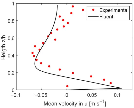 The axial profile of the experimental [20] time-averaged velocity () at x/L = 0.5 is compared with the predicted profile from the developed model in Figure 6. The mathematical model accurately predicts the measured velocity profile with a mean relative error of 20.77 ± 20.73%. This confirms the robustness of the model to calculate tundish fluid flow. Near the free surface, small discrepancies exist between predictions and measurements. Near the bottom wall, even smaller discrepancies are observed. These results suggest that deformation of the free surface needs to be accounted for in the next model version. The current model uses a flat, fixed free surface to reduce computational cost and avoid multiphase methods like VOF. While this limits how we capture dynamic surface effects, validation shows that the model still gives reasonably accurate predictions without a deformable surface. Additionally, treatment of the walls should be fine-tuned by improving the description of the laminar-to-turbulent connection. Currently, the standard wall functions are used, but it may be necessary to consider alternative wall functions or set specific values for shear stresses or wall surface roughness.