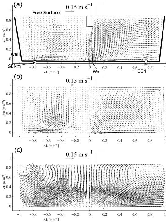 Figure 7 and Figure 8 present the tundish velocity vector fields, without flow modifiers, for three longitudinal and two transverse planes, respectively. These planes are described in Figure 3 and Table 3. On the left side, experimental velocity measurements obtained using PIV are presented; on the right side, the calculated velocity vectors derived from the mathematical model are presented. In general terms, the mathematical model properly captures the qualitative behavior of the fluid flow measured by PIV in the physical model (Figure 7 and Figure 8), considering that the experimental measurements show some fluctuations and errors due to the optical nature of the PIV measurements and the appearance of some physical interferences and optical aberrations. For instance, the mathematical model results exhibit perfect symmetric behavior due to the assumption of symmetric planes, whereas the experimental measurements reveal some asymmetries resulting from the inherent experimental error. Additionally, the mathematical model’s predicted velocity magnitude is overestimated in certain regions, particularly due to the numerical simulation’s inaccurate representation of the wall interaction with the fluid at the bottom wall.