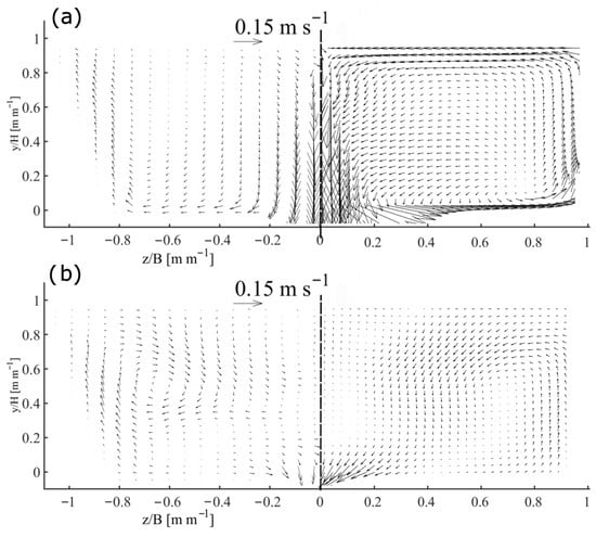 Figure 8b (transverse plane yz at x = 0.44 m) shows a flow field with completely different behavior compared to Figure 8a. The jet radial movement is not perceptible in this transversal plane located away from the fluid inlet; however, circulation loops are captured in both the physical and the numerical models, and the position and magnitude of the loops are similar in both cases. These circulation loops are not generated due to the interaction of the jet movement in this plane; in this case, they are caused by the projections of the three-dimensional circulation loops shown in the middle planes (measurement planes 1 and 4 in Figure 3). As is presented in Table 4, the relative error in the mean velocity magnitudes increases (15–68%) as the measurement plane moves from the symmetry (water inlet longitudinal plane) and moves closer to the walls (planes 1–3, see Figure 3). In the transversal planes (planes 4 and 5, see Figure 3), the overprediction of the velocity magnitude by the numerical simulation is even higher (93–139%). These discrepancies suggest limitations in the turbulence model used. The system under study exhibits both high- and low-velocity regions, making it difficult for the available RANS turbulence models to accurately capture the full range of flow behavior in all planes, especially the secondary flow patterns. The increased errors near the walls may suggest additional issues with the wall function implementation. In addition, the assumption of a flat free surface is preventing the model from properly dissipating energy through the surface deformation and wave motion, as occurs in reality, contributing to the deviation between numerical and experimental results.