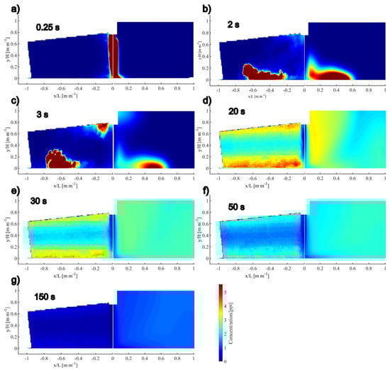 Instantaneous experimental concentration contours (left) and predicted by the model concentration contours (right), obtained at (a) 0.25 s, (b) 2 s, (c) 3 s, (d) 20 s, (e) 30 s, (f) 50 s, and (g) 150 s.