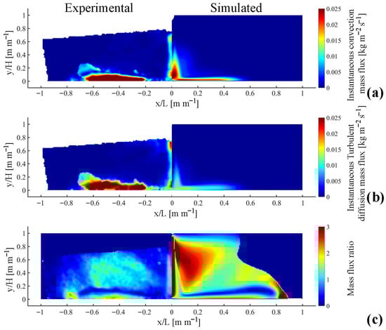 To further investigate the mass transfer physics, Figure 10 presents the comparison of experimental and numerical simulated instantaneous (at time of 2 s after tracer injection) convective flux, turbulent diffusion flux, and the ratio between both mass transfer mechanisms () calculated as (Equation (23)):