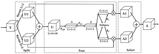 The one-dimensional vibration signal of faulty bearings is simultaneously transformed into time–frequency domain representation and then input into a dual-path parallel residual network framework. In the standard convolutional neural network, the size of the convolutional kernel in each layer remains fixed. By contrast, the selective kernel network (SKNet) features a dynamic convolutional kernel selection mechanism [26]. This mechanism dynamically adjusts the receptive field size based on the multi-scale features of input data for each neuron. The cornerstone of the selective kernel network is the selective kernel convolution module. This module integrates information from multiple branches with different kernel sizes by leveraging softmax attention. It also employs an adaptive selection mechanism to make an adaptive choice regarding the size of the convolutional kernel.