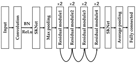 Based on the foregoing analysis, this study aims to improve the ResNet model by integrating the SKNet module into the ResNet architecture. In the main body of the network, to prevent the introduction of excessive parameters and avoid model structure redundancy, the original residual structure is retained. After being processed by four residual blocks, the SKNet module is embedded for secondary enhancement. By adaptively adjusting the selection of convolutional kernels, this approach ensures that features at different scales can be effectively represented and exploited. Finally, the model performs global average pooling followed by a fully connected layer. The enhanced ResNet18 is presented in Figure 3.