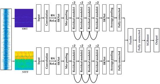 The overall architecture of the STFT-SWT-P2D-Sk-ResNet-XGBoost framework is illustrated in Figure 4, which outlines an end-to-end pipeline for intelligent fault diagnosis.