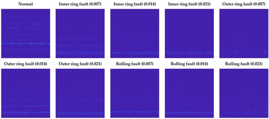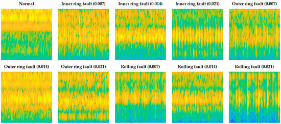 In this experiment, each continuous signal is segmented using a fixed-length sliding window. The window length is set to 1024 data points with a step size of 341. For each fault category and load condition, 1000 samples are obtained. Subsequently, these 1D samples are transformed into 2D images using both SWT and STFT. Datasets A0, A1, and A2 correspond to the sample sets under loads of 0, 1, and 2 hp, respectively. Each dataset (A0, A1, A2) contains 1000 STFT and 1000 SWT images for each of the 10 fault conditions, resulting in 20,000 images per dataset. The procedure for converting time-series data into images is illustrated in Figure 5. Herein, the red rectangle represents the current position of the sliding window, and the gray rectangle represents its historical positions along the time axis. Example SWT and STFT plots for various bearing conditions are shown in Figure 6 and Figure 7, respectively. The color mapping in both diagrams illustrates the signal’s energy distribution across time and frequency. In the SWT plot (Figure 6), areas of lower energy are depicted in dark blue, transitioning to light blue and white for higher energy. Similarly, in the STFT plot (Figure 7), lower energy density is shown in blue, and higher energy density is indicated by yellow, directly correlating with local signal strength.
