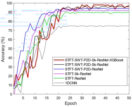 However, a more nuanced analysis reveals that the performance gains significantly outweigh the associated computational costs. Crucially, the addition of the SK mechanism to create the STFT-SWT-P2D-Sk-ResNet model incurs only a minimal parameter increase (from 22.42 M to 23.61 M, a rise of approximately 5.3%) and a negligible extension in training time. This minor cost is justified by a substantial performance boost of 2.29 percentage points in accuracy (from 94.71% to 97.00%). This demonstrates that the SK mechanism efficiently enhances feature representation without introducing significant structural redundancy. Furthermore, replacing the standard softmax classifier with XGBoost in the final model results in a further accuracy improvement of 1.51 percentage points, while the training time increases by a mere 0.41 s. This demonstrates the exceptional efficiency of the XGBoost classifier. The 42.24 s training time for a model achieving 98.51% accuracy remains entirely feasible for an offline training process, establishing the proposed framework as a powerful and practical solution.