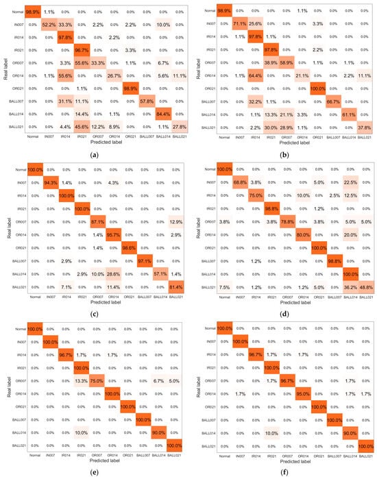 The confusion matrix for the models, including 1DCNN (a), STFT-ResNet (b), STFT-Sk-ResNet (c), STFT-SWT-P2D-ResNet (d), STFT-SWT-P2D-Sk-ResNet (e) and STFT-SWT-P2D-Sk-ResNet-XGBoost (f).