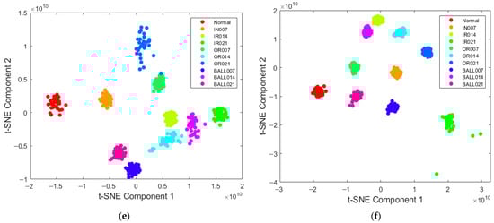 The T-SNE image of the models, including 1DCNN (a), STFT-ResNet (b), STFT-Sk-ResNet (c), STFT-SWT-P2D-ResNet (d), STFT-SWT-P2D-Sk-ResNet (e) and STFT-SWT-P2D-Sk-ResNet-XGBoost (f).