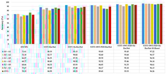 To evaluate generalization capability under varying operational conditions, cross-domain experiments were conducted using datasets A0, A1, and A2 (0, 1, and 2 hp). As shown in Figure 11, the notation A0→A1 indicates training on A0 and testing on A1. AVG denotes the average accuracy across all variable-load scenarios.