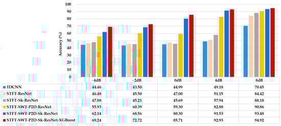 The anti-noise performance was investigated by adding Gaussian white noise with different signal-to-noise ratios (SNRs: −4, −2, 0, 4, 8 dB) to the original A1 dataset. The noisy data were transformed into images, and the dataset was split 8:2 for training and testing. For each SNR level, 20 repeated experiments were conducted, and the average accuracy was recorded. Figure 12 shows the average recognition accuracy of each network model under different SNR conditions.