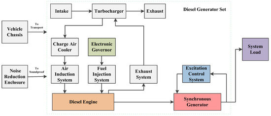 Vehicle power supply is a typical complex electromechanical system. An analysis of its primary structure (see the schematic diagram in Figure 1) indicates that the key component determining its performance metrics and power quality is its diesel generator set. This core unit is primarily composed of a diesel engine with its electronic governor system and a synchronous generator with its excitation control system.