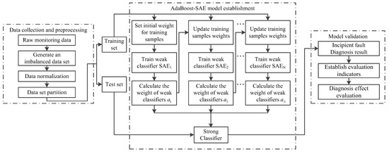 For incipient fault diagnosis of vehicle power supply under imbalanced data conditions, the overall framework of the AdaBoost-SAE-based model is illustrated in Figure 3. The construction process of the diagnostic model includes three major phases: data acquisition and preprocessing, construction of the AdaBoost-SAE diagnosis model, and model validation.