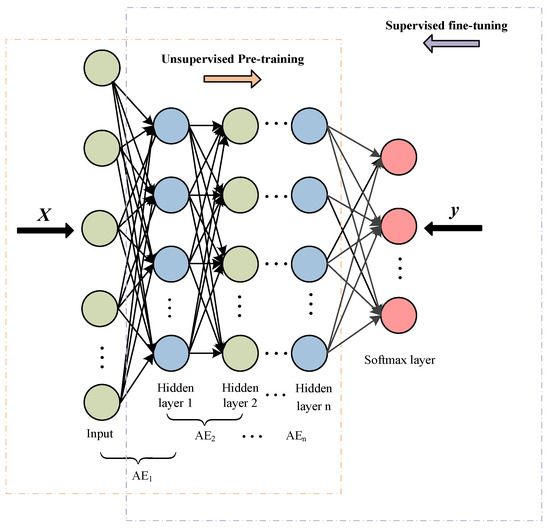 After the forward unsupervised training, the weight and bias of each layer are taken as the initial weight and bias of the SAE, the error between the actual value of the sample label and the predicted value output by the Softmax layer is calculated by the backpropagation algorithm, and the weight and bias of each layer are fine-tuned using the Gradient Descent Method. Thus far, after fine-tuning, all parameters of SAE network are in a relatively optimal position, and the network training is completed. In the deep learning ensemble model, the structure of the weak classifier SAE network is shown in Figure 4. It employs a combination of unsupervised pre-training (forward) and supervised fine-tuning (backward) for feature learning.
