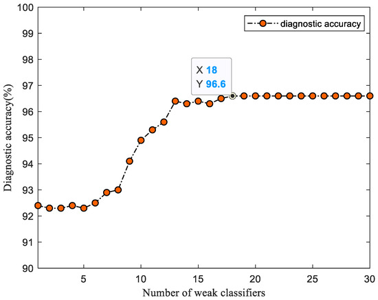It can be seen intuitively from Figure 5 that the number of weak classifiers (SAE) increases one by one from the initial one, and the overall fault diagnosis accuracy also shows an increasing trend. Finally, when the number of weak classifiers reaches 18, the model fault diagnosis accuracy tends to be stable, reaching 96.6%. After that, when the number of base classifiers is increased, the fault diagnosis accuracy remains unchanged, indicating that AdaBoost-SAE model can achieve better fault diagnosis results when the number of weak classifiers is 18.