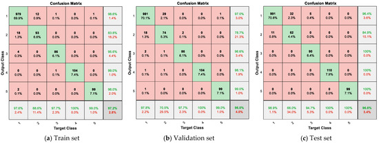 The confusion matrix can directly and comprehensively reflect the diagnostic accuracy and recall rate of different incipient faults of vehicle power supply, as well as the number of samples misdiagnosed and missed diagnosis of various incipient faults. Therefore, the incipient fault diagnosis results of vehicle power supply based on AdaBoost-SAE model under imbalanced samples were visualized using the confusion matrix, as shown in Figure 6 (including train set, validation set, and test set). Here, only the confusion matrix of the diagnostic results of the test set is analyzed. The green cells along the main diagonal represent the correctly diagnosed samples and their proportions, while the gray cell in the bottom-right corner indicates an overall fault diagnosis accuracy of 96.6%. The first row of the matrix indicates that for the first working condition, 991 samples were correctly classified, while 37 samples were missed, resulting in a recall rate of 96.4% and a miss rate of 3.6%. The first column shows that 11 samples were misclassified as the first working condition, yielding a diagnostic precision of 98.9%.