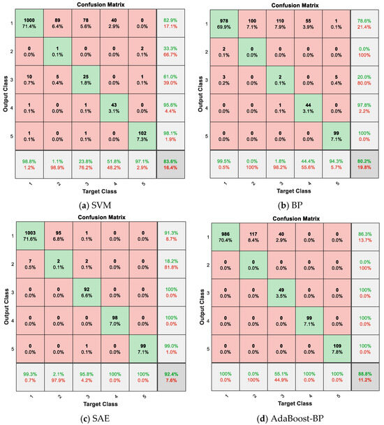 To validate the performance advantages of the AdaBoost-SAE model in diagnosing incipient faults of vehicle power supply under imbalanced sample conditions, the following four models were established as reference groups in the simulation experiments: a BP model based on shallow neural network, a traditional machine learning algorithm SVM, an AdaBoost-BP ensemble model (which has achieved optimal accuracy after 20 rounds of iterative training), and a SAE network. Figure 7 comparatively presents the diagnostic result differences between the reference groups and the proposed model through confusion matrices.