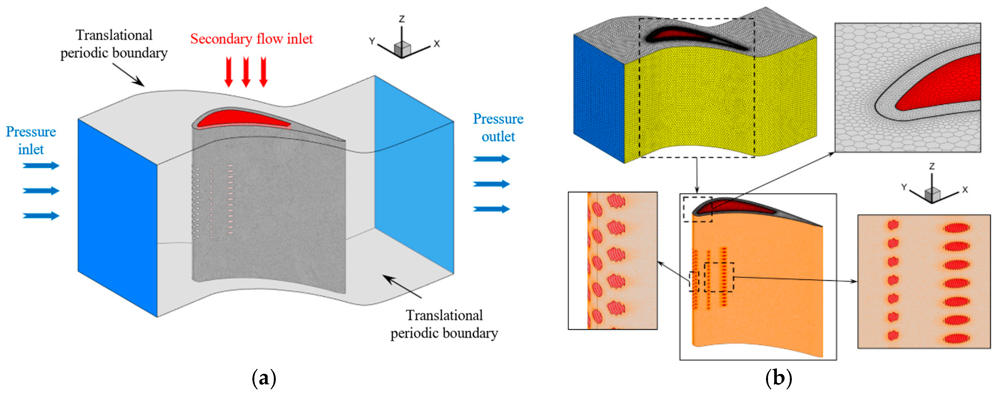 - Li, G.; Wan, L. Film cooling improvement of dovetail hole compared to cylindrical hole at different hole row locations on nozzle guide vane. Case Stud. Therm. Eng. 2023, 45, 103015. [Google Scholar] [CrossRef]